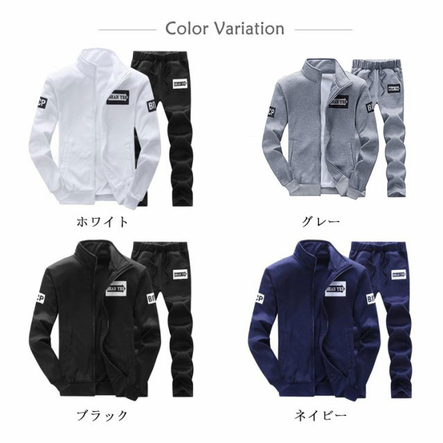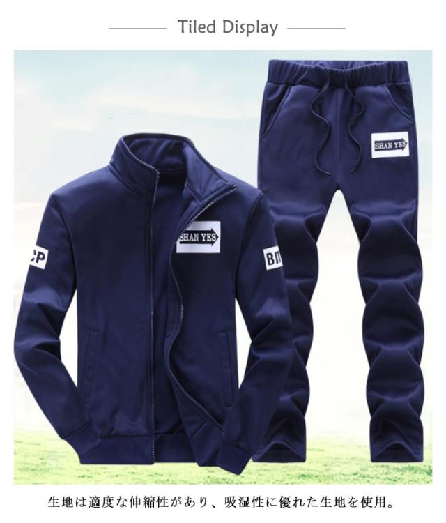 | 定番デザインのメンズセットアップ 生地は適度な伸縮性があり、吸湿性に優れた生地を使用。 裏は微起毛のトリコット素材で適度な保温性◎ パンツのウエストは紐とゴムシャーリングのイージーパンツ仕様。 シルエットは程よくゆとりのあるシルエットを演出する。 トレーニングウェアとしてはもちろん、部屋着として活用するのもおすすめです。 | |