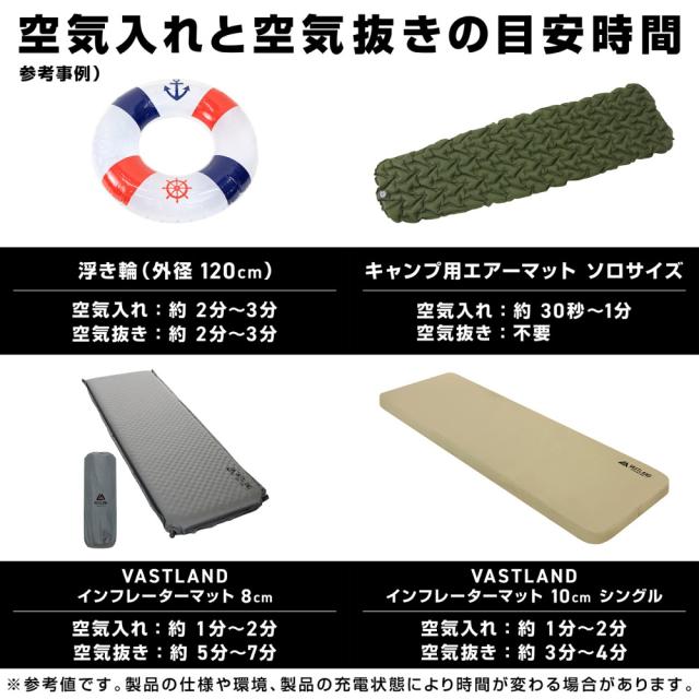 また、最大圧力は約3.5kPaで、空気抜きにも対応しています。(参考値です。製品の仕様や環境、製品の充電状態により時間が変わる場合があります。)