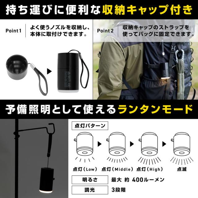 最大風量は約170L/分とパワフルで、インフレーターマットに1〜2分で空気を充填できます。