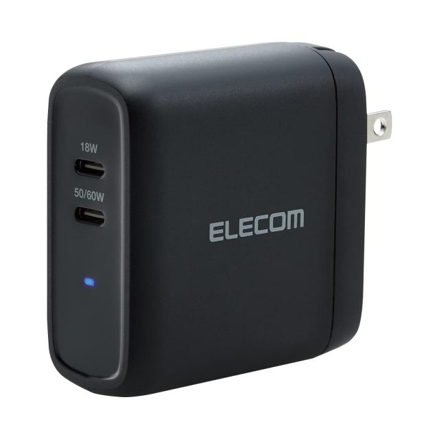 USB Power Deliveryに準拠したUSB Type-C(TM)(USB-C(TM))ポートを搭載し、対応するノートパソコンやスマートフォン、タブレットなどを超高速充電ができるUSB AC充電器です。 従来のシリコン半導体と比べると発熱を抑える事が出来る新材料「GaN(窒化ガリウム)」を採用することで、製品の小型化及び軽量化を実現しました。 USB Power Delivery(パワーデリバリー)とは、アダプターと接続機器間で情報をやり取りすることで、その機器間における最適な電力を選択し、高速充電を実現するUSB規格です。最大100W(※)という高電力に対応するため、さまざまな機器での利用が広がっています。※本製品のUSB Power Delivery最大出力は60Wです。 小型・軽量なので外出や出張などの際の持ち運びに便利です。 50/60W(MAX)ポートは端末に応じて出力が5V/3A、9V/3A、15V/3A、20V/3Aと可変し、iPhoneなどのスマートフォンから、NINTENDO SWITCH(TM)などのゲーム機、対応のノートパソコンまで幅広く高速充電できます。※2ポート同時接続は50/60W(MAX)ポートのみ最大20V/2.5Aとなります。※NINTENDO SWITCH(TM)はドックでの充電はできません。