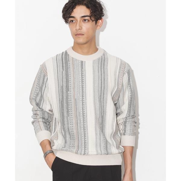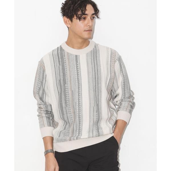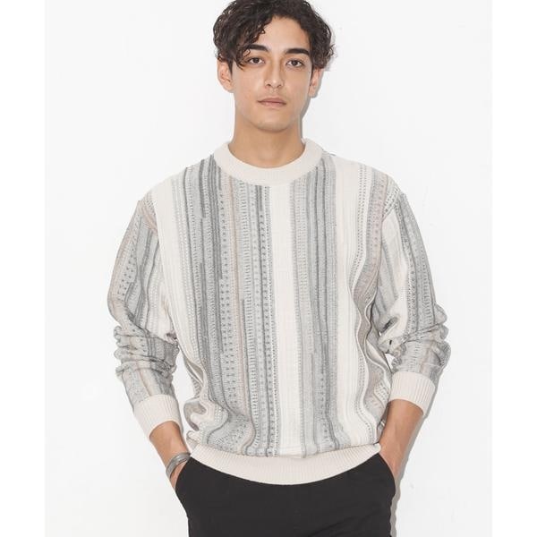 凹凸感のあるリンクス編みを使用した幾何学柄クルーネックニット。