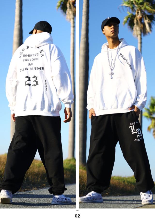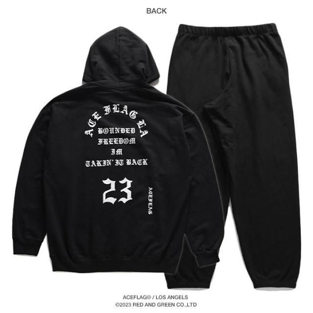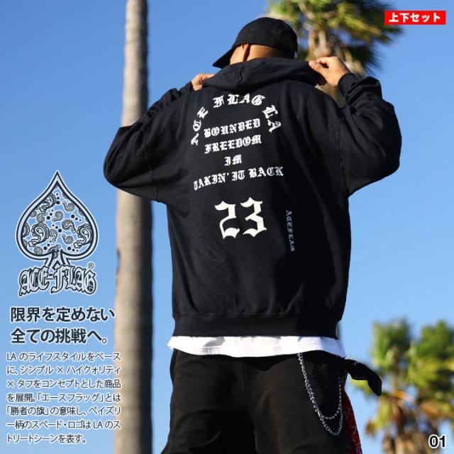 ACE FLAG 上下セット 長袖 スケボー メンズ 春秋冬用 黒/白 大きいサイズ エースフラッグ セットアップ パーカー フーディ 上下 メッセージ 数字 ナンバー 23 パブロ b系 ヒップホップ ストリート系 ハイ 新作 AF-SE-PA-038