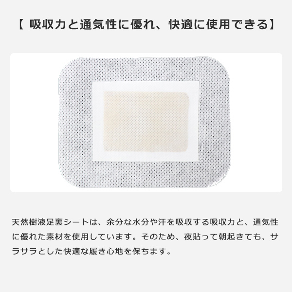 天然樹液足裏シートは、余分な水分や汗を吸収する吸収力と、通気性に優れた素材を使用しています。 そのため、夜貼って朝起きても、サラサラとした快適な履き心地を保ちます。