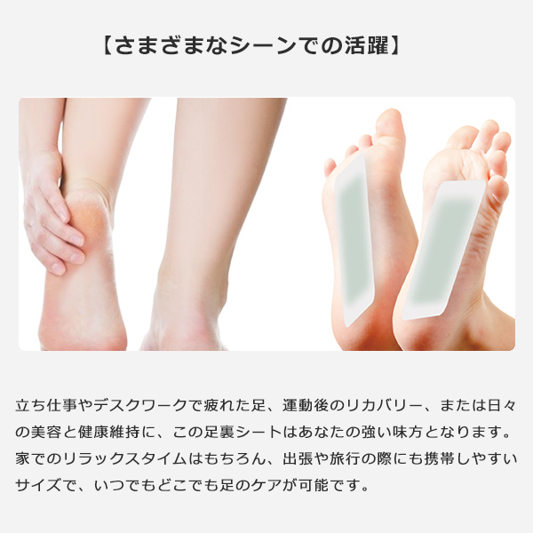 立ち仕事やデスクワークで疲れた足、運動後のリカバリー、または日々の美容と健康維持に、 この足裏シートはあなたの強い味方となります。家でのリラックスタイムはもちろん、 出張や旅行の際にも携帯しやすいサイズで、いつでもどこでも足のケアが可能です。