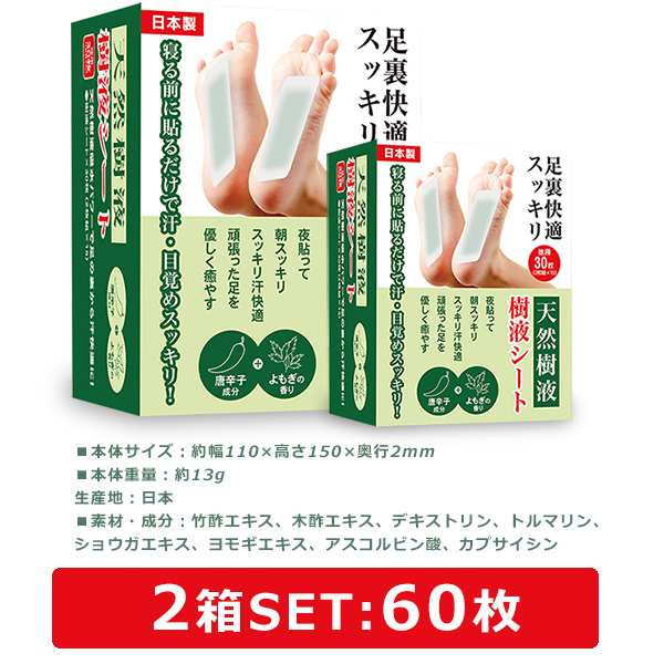 | 商品説明 | 長い一日の疲れを癒す「天然樹液 足裏シート」。簡単に貼るだけで足裏ケアが可能。 自然由来成分でリラックス効果を促し、朝スッキリ目覚めることができます。日本製で品質も安心、毎日の足の健康をサポートします。 【足の疲れや悩みを抱えるあなたへ】 長時間立ち仕事やデスクワークで、足が疲れていませんか?運動後や、日々の生活で、足に悩みはありませんか? そんなあなたに、おすすめしたいのが、天然樹液足裏シートです。 【 吸収力と通気性に優れ、快適に使用できる】 天然樹液足裏シートは、余分な水分や汗を吸収する吸収力と、通気性に優れた素材を使用しています。 そのため、夜貼って朝起きても、サラサラとした快適な履き心地を保ちます。 【寝ている間に足元を優しくケア】 使い方は簡単です。 夜寝る前にシートを足裏に貼るだけで、寝ている間に足元を優しくケアしてくれます。 翌朝起きると、足裏がスッキリして、疲れが取れたように感じられます。 【さまざまなシーンでの活躍】 立ち仕事やデスクワークで疲れた足、運動後のリカバリー、または日々の美容と健康維持に、 この足裏シートはあなたの強い味方となります。家でのリラックスタイムはもちろん、 出張や旅行の際にも携帯しやすいサイズで、いつでもどこでも足のケアが可能です。 天然樹液 足裏シートは、足裏の疲れやだるさをスッキリ解消する便利なアイテムです。 寝ている間に足元をケアできるので、忙しい人でも手軽に使用できます。 ぜひ、この機会に天然樹液 足裏シートをお試しください。 > 【製品仕様】 内容量:シート60枚(2箱SET) 本体サイズ:約幅110×高さ150×奥行2mm 本体重量:約13g 生産地:日本 ■素材・成分:竹酢エキス、木酢エキス、デキストリン、 トルマリン、ショウガエキス、ヨモギエキス、アスコルビン酸、カプサイシン 【ご使用方法】 1.シートの広い面の紙を剥がします。 2.就寝前に足の裏に貼ります。(入浴後の清潔なお肌にご使用ください) 個人差により水分が多量にシミ出る場合がありますので、タオル等でくるんでおやすみください。 ※床シートをはがし、よく水で洗い流してください。 ※使用感には個人差があります。 ※体内の水分が吸着することにより、シートが変色します。 【使用できる部位] 足裏 それ以外の部位へのご使用はおやめください。 【注意事項】 ●食品ではありません。目や口に入れないでください。万一、湿疹・かぶれ等が出た場合は使用を中止してください。 ●肌の状態に異常が認められた場合はすぐに外してください。 ●傷口又は外傷、皮膚異常のある部位には使用しないでください。 ●汗をかいていると張り付きにくくなりますので、良く拭いてから使用してください。シートを貼ったまま靴を履くと、靴や靴下に付着することがありますのでご注意ください。 ●開封後の樹液シートの未使用分は袋に入れ、シートが外気に触れないように開封口のジッパーを留めて保存してください。 ●直射日光、高温多湿の場所は避け、なるべく涼しい場所に保管してください。 ●子供の手の届く所に置かないようにしてください。 ※個人差により、足の裏がベトつく恐れがありますので、ご使用後は濡れた布で拭きとるか又は洗い流してください。 |