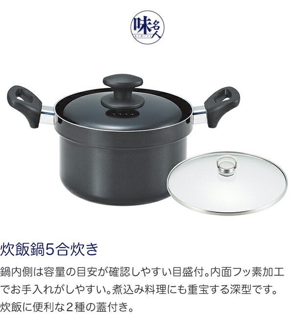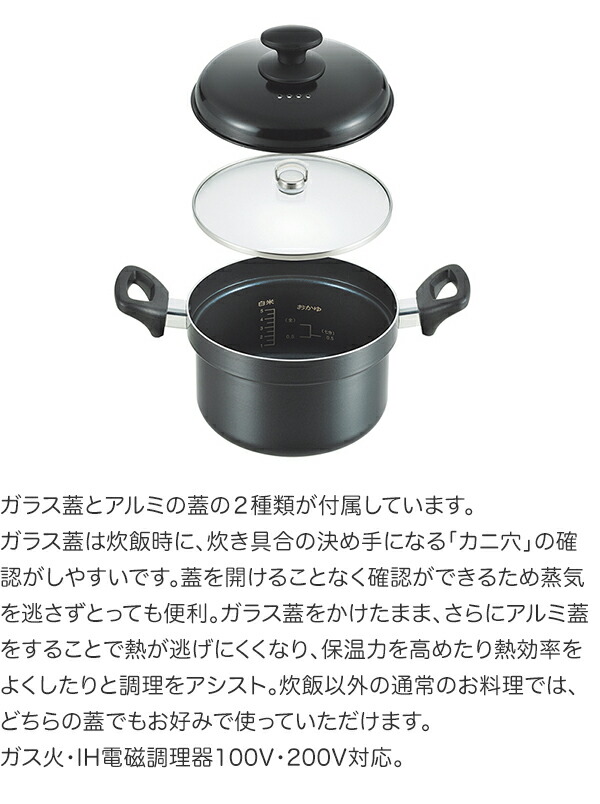 鍋内側は容量の目安が確認しやすい目盛付。内面フッ素加工でお手入れがしやすい。煮込み料理にも重宝する深型です。炊飯に便利な2種の蓋付き。ガラス蓋とアルミの蓋の2種類が付属しています。ガラス蓋は炊飯時に、炊き具合の決め手になる「カニ穴」の確認がしやすいです。蓋を開けることなく確認ができるため蒸気を逃さずとっても便利。ガラス蓋をかけたまま、さらにアルミ蓋をすることで熱が逃げにくくなり、保温力を高めたり熱効率をよくしたりと調理をアシスト。炊飯以外の通常のお料理では、どちらの蓋でもお好みで使っていただけます。ガス火・IH電磁調理器100V・200V対応。 |