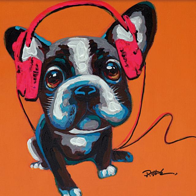 お部屋の雰囲気を明るくしたり、インテリアのアクセントにしたり。飾ると、おうちが小さな美術館のような空間になる、オイルペイントシリーズ。ヘッドフォンがクールなワンちゃん。背景のオレンジとヘッドフォンのレッドのビビットカラーがポップな作品です。
