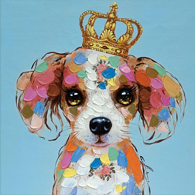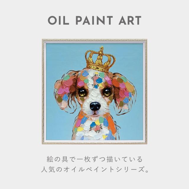 お部屋の雰囲気を明るくしたり、インテリアのアクセントにしたり。飾ると、おうちが小さな美術館のような空間になる、オイルペイントシリーズ。お顔の多彩な配色も個性的で楽しい。可愛い表情のワンちゃんの頭には王冠がのっています。