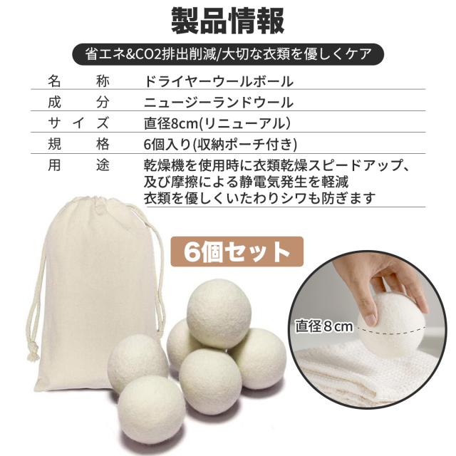 名称:ドライヤーウールボール 成分:ニュージーランドウール サイズ:直径8cm 規格:6個入り(収納ポーチ付き) 用途:乾燥機を使用時に衣類乾燥スピードアップ、及び摩擦による静電気発生を軽減。衣類を優しくいたわりシワも防ぎます |