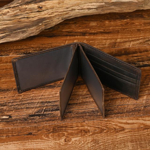 クレイジーホースレザー(Crazy Horse Craft)とは、表面をヤスリで凹凸を付け、オイルを染み込ませやすくする牛革製法です。クレイジーホースレザーは使い込むと色艶を増し、経年変化により自分だけの味が出てきます。使い始めは少し固いと感じるかもしれませんが、使う度にしなやかに手に馴染んでくるのがクレイジーホースレザーの特徴です。