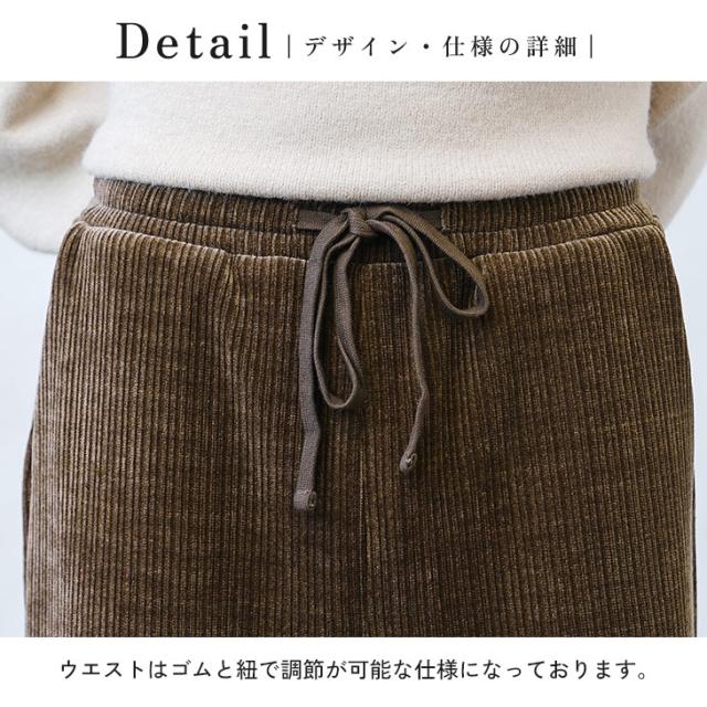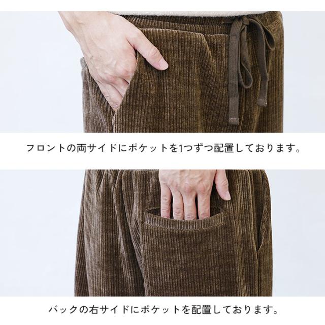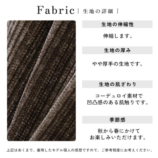 やや起毛がかっており、見た目から暖かさを感じるコーデュロイ生地。秋冬にぴったりな程よい厚みを持ちながらも伸縮性があり、ルームウェアのようなくつろぎのひと時にも愛用できる仕様のアイテムです。