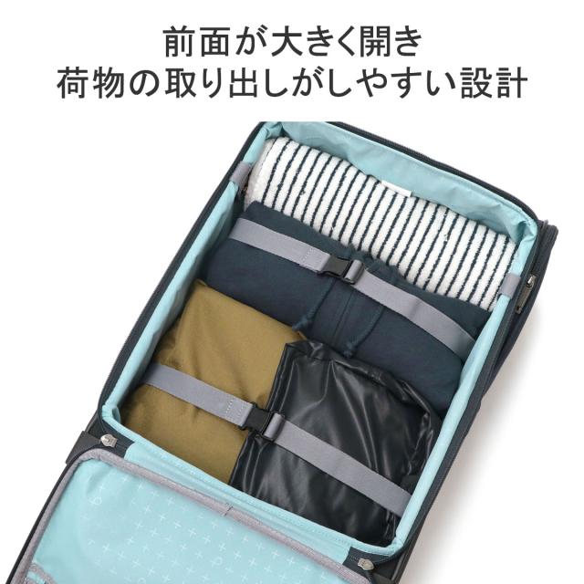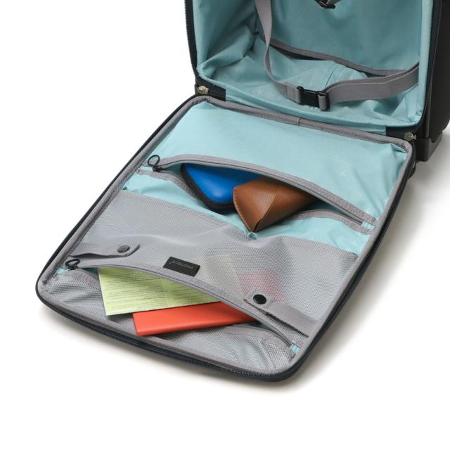 本体にはフロントとサイドに、小物等をすぐに取り出せるファスナーポケットを搭載し、荷物の取り出しや管理をストレスフリーに行うことができます。また、メインルーム内部には、フルオープン時に中を隠せる、着脱可能なフラップが付属しているなど、セキュリティ面にも配慮した設計になっています。
