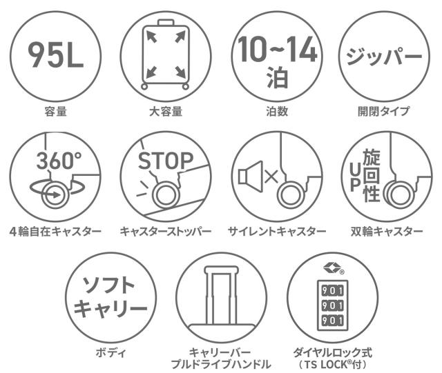 プロテカ/PROTeCA/ACTOY 2/アクトーイ 2/キャリーケース/キャリーバッグ/スーツケース/ソフトケース/ソフトキャリー/ソフトトロリー/トロリー/旅行バッグ/トラベルバッグ/Lサイズ/95L/95リットル/10〜14泊/10泊/11泊/12泊/13泊/14泊/2週間/長期/TSロック/TSAロック/TS/TSA/アウターポケット/外ポケット/フロントポケット/ジッパー/ジッパータイプ/サイレントキャスター/静音/静か/ベアロンホイール/4輪/マジックストップ/キャスターストッパー/ストッパー/ポリエステル/旅行/出張/トラベル/シンプル/カジュアル/高品質/エース/ACE/ブランド/日本製/メンズ/レディース