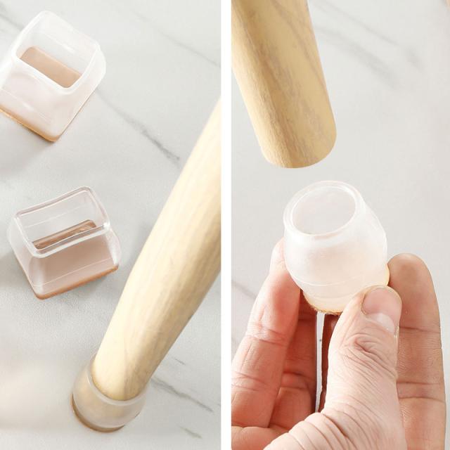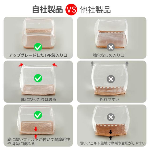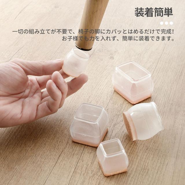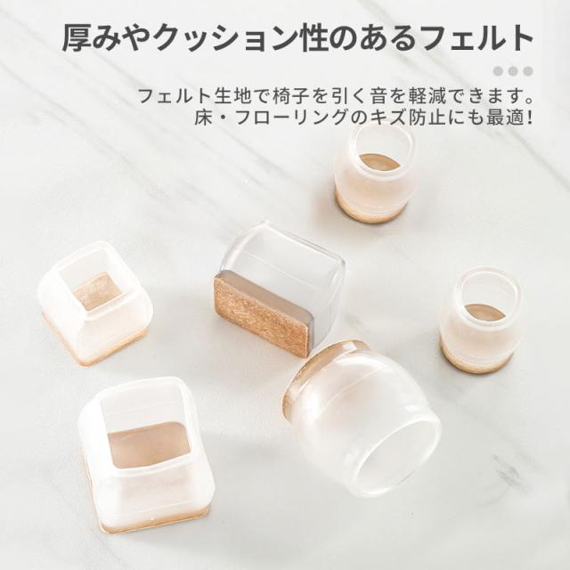 大切な床を傷から守る椅子脚カバーが登場しました!柔らかいTPR素材で優れた耐久性があり、破れる心配がありません。優れた柔軟性があり、椅子の形に合わせて自由に引っ張ることができます。底部にフェルト一体型設計で床を傷から守ります!フェルト生地で椅子を引く音を軽減でき、重い椅子やテーブルなどの家具の移動も楽々。お手入れ簡単!汚れたら、水洗いだけで繰り返して使用でき、環境にも優しい椅子脚カバーです。一切の組み立てが不要で、椅子脚にカパッとはめるだけで完成!お子様でも力を入れず、簡単に装着できます。正方形、円形、長方形の3タイプ、サイズも選択可能なので、取り付ける椅子のタイプを選ばず、丸脚でも角脚でも使えます。家具の色に馴染む透けるカラーで、目立たなく、お気に入りのチェアの見た目を損なうことなくご使用いただけます!
