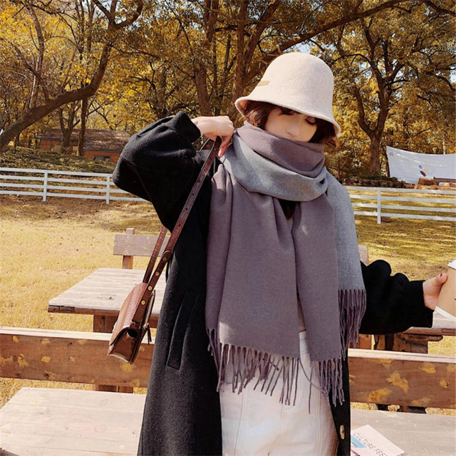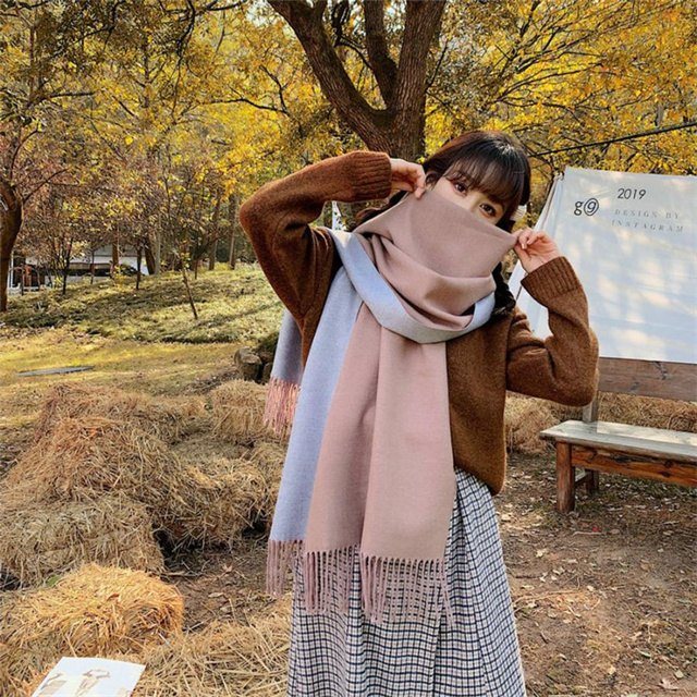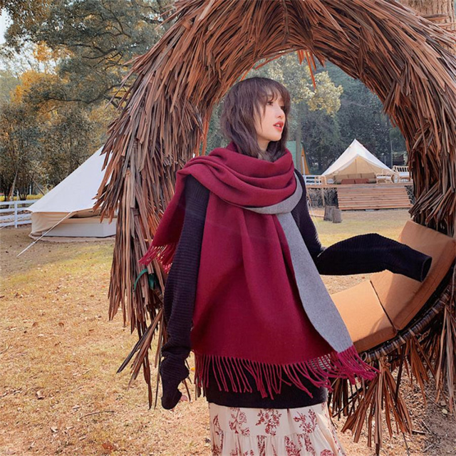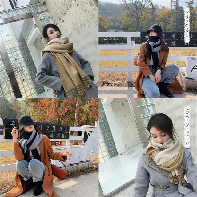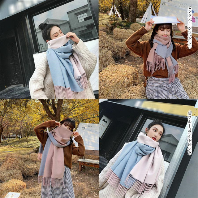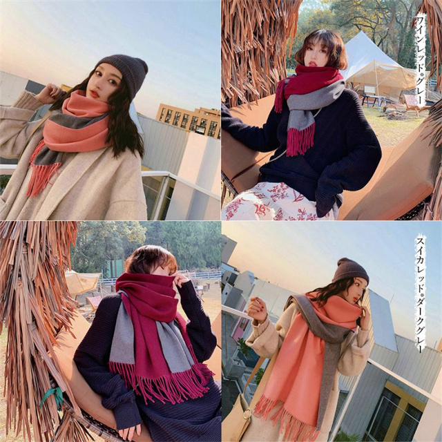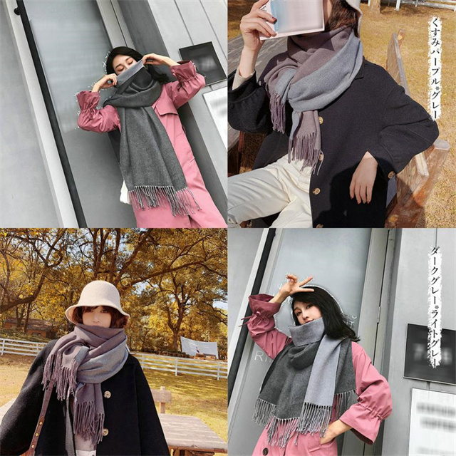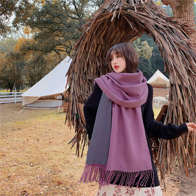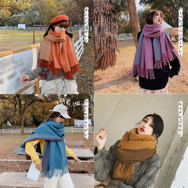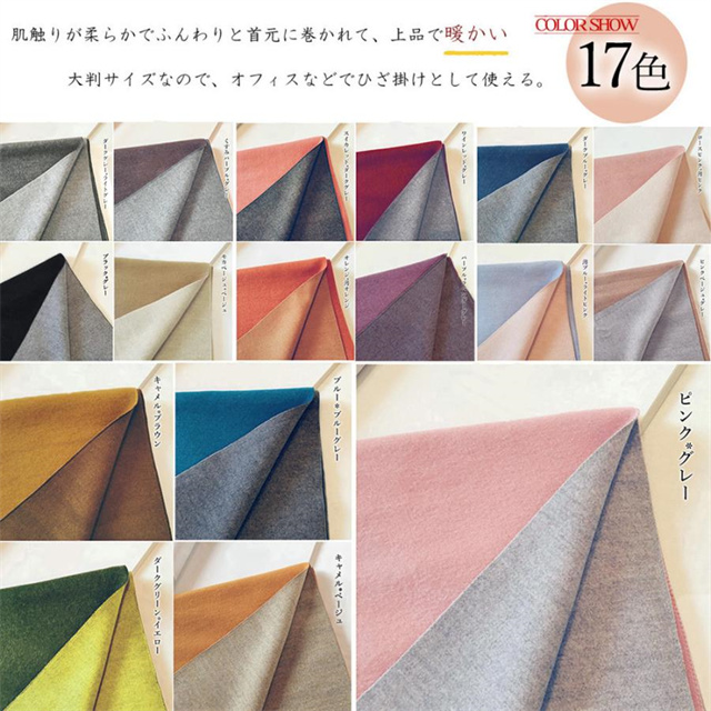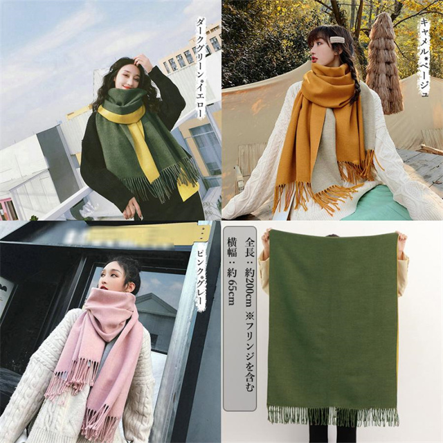 シンプルでスタイリッシュなフリンジ付きデザイン。1枚でオシャレの幅が広がる大判配色ストール ツートンカラーのリバーシブル仕様なので、巻き方次第で雰囲気が変わり、コーディネートの幅も広がります、その日の気分でアレンジ自在