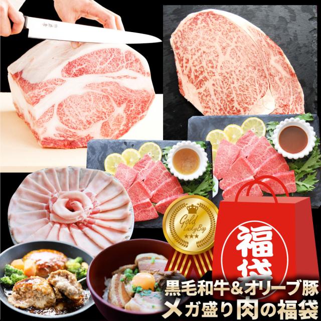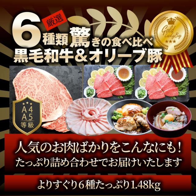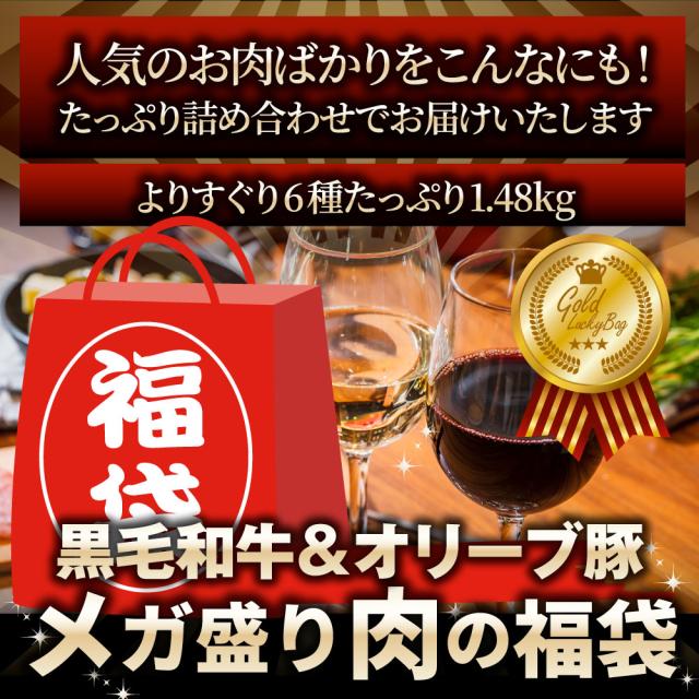 肉の福袋 ゴールド メガ盛り A4,A5等級 黒毛和牛入り 総重量1.48kg( 6種 食べ比べ )完全赤字の肉袋!人気のお肉ばかりの豪華セット 福袋 牛肉 焼肉セット 焼肉 ランキング1位 黒毛和牛 ステーキ カルビ ハンバーグ オリーブ豚 ロース 送料無料 お肉の しゃぶまる