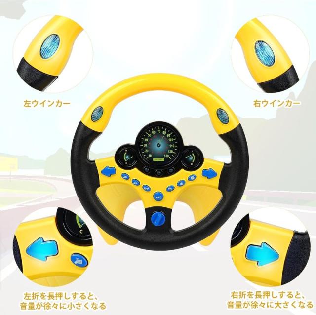 【音量調整・子供の車のおもちゃ】:左折(右折)を長押しすると、音量が徐々に小さく(大きく)なります。●材質:ABSプラスチック●電池:単3電池3本使用(別売)●対象性別 : 男女兼用?※長時間遊ばない時は、必ず電池を外してください。ぶつけたり、振り回すなど乱暴な遊びをしないでください。