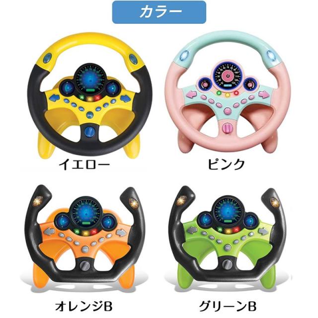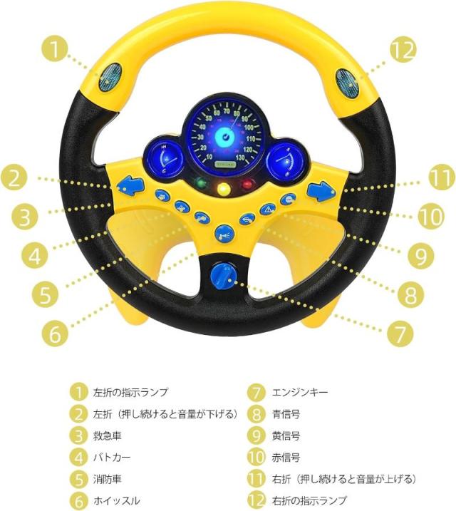 【サイレン音と光るランプ】:サウンドやライトがついた、ドライブごっこができるハンドルのおもちゃです。左の「3種類の緊急車両」ボタンを押すと、それぞれ救急車、パトカー、消防車、のサイレン音が流れて、サイレンランプが点滅します。右の「信号機ボタン」を押すと、それぞれの音+ランプが光ります。[左右折ボタン]ウインカー音+相応ウインカーランプが点滅します。ドライブ体験が楽しいながら、交通ルールと運転マナーも学べるハンドルおもちゃです♪