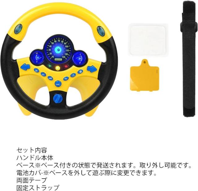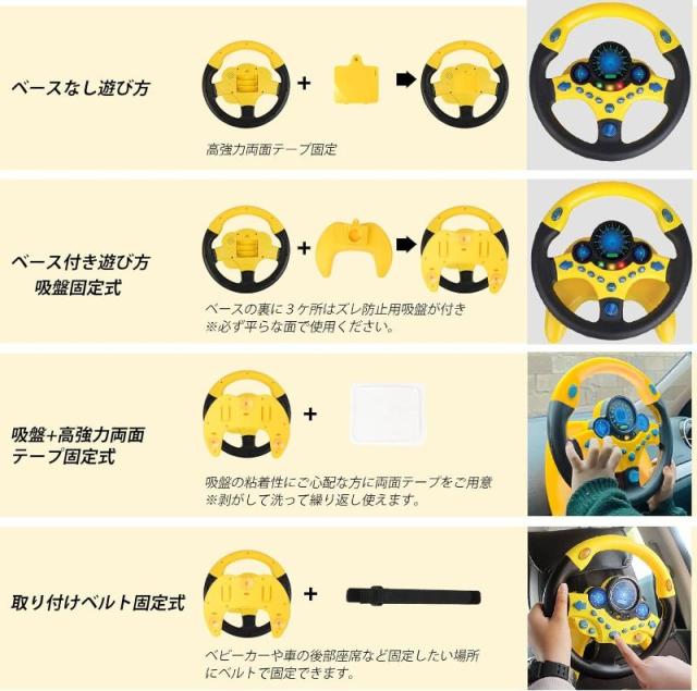 【いろんなシーンに対応】:土台の裏で3つ吸盤があり&高強力両面粘着テープ付けるので、冷蔵庫のドアで・ベビーカードで・ゆかで・副操縦士席でいろんな平滑なところを固定して遊べます。取り付けベルトがつきで、大人の運転中に後部座席で本格的なドライブ遊びべます。使用シーンによって固定方式をお選びいただけます。
