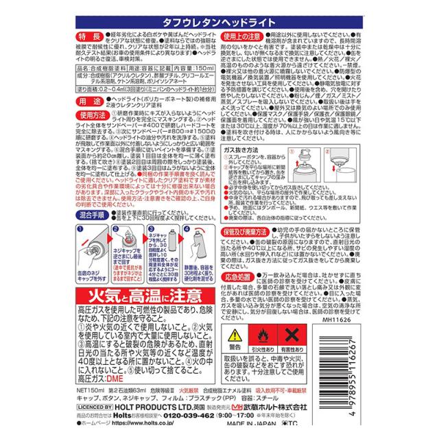 タフ ウレタンヘッドライトスプレー ヘッドライト専用クリアスプレー 2液性 150ml 耐候性・耐ガソリン性・耐衝撃性 ホルツ MH11626