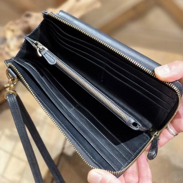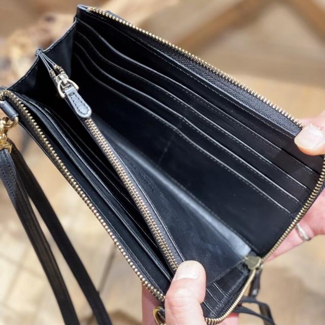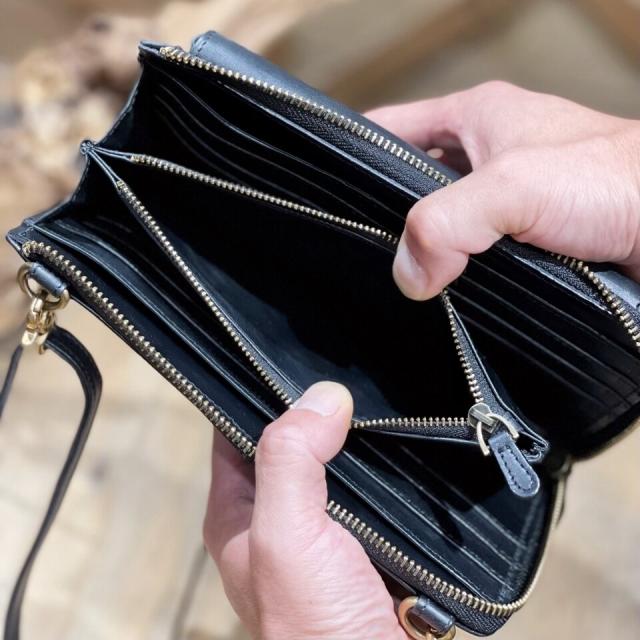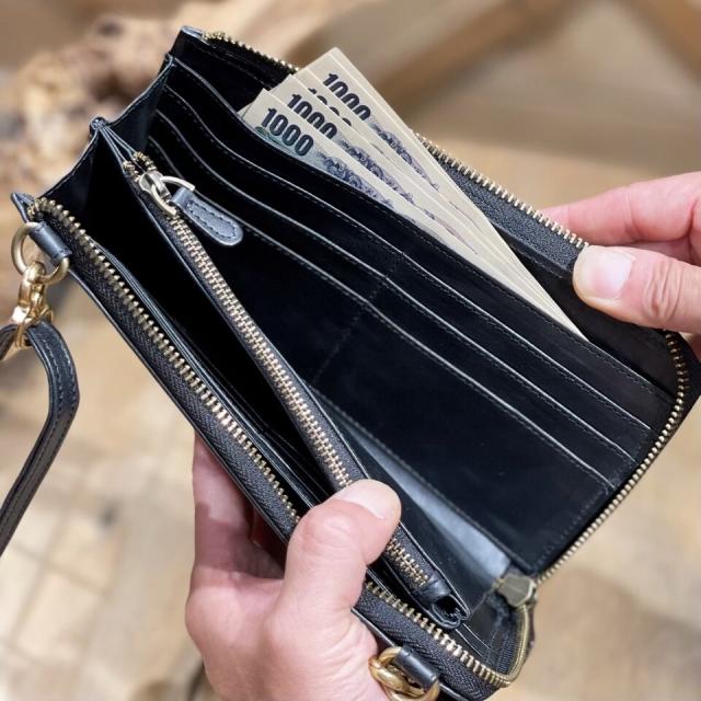 メインのL字ファスナーを開ければ、カードポケットが12ヶ所、お札ポケットが2ヶ所、小銭入れが1ヶ所ある大容量の財布に。