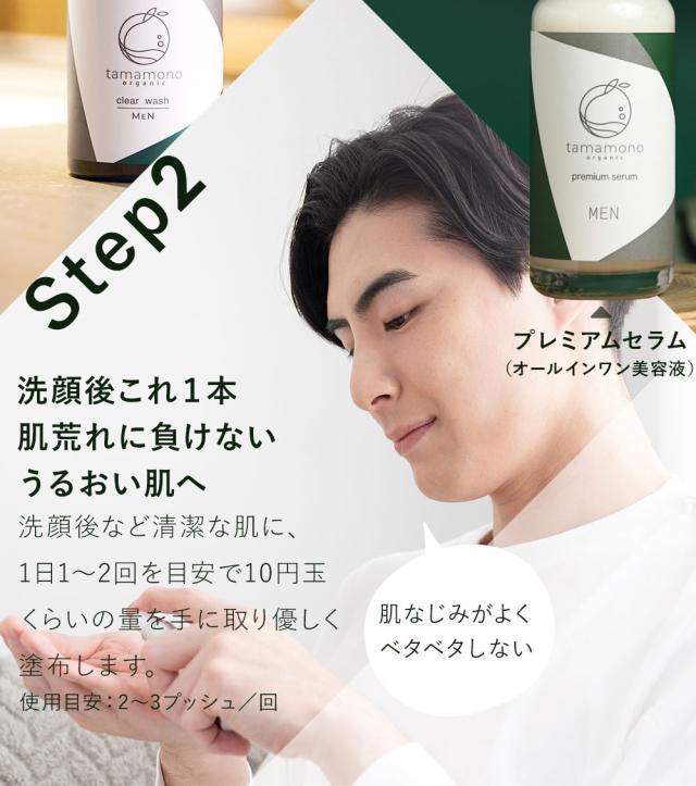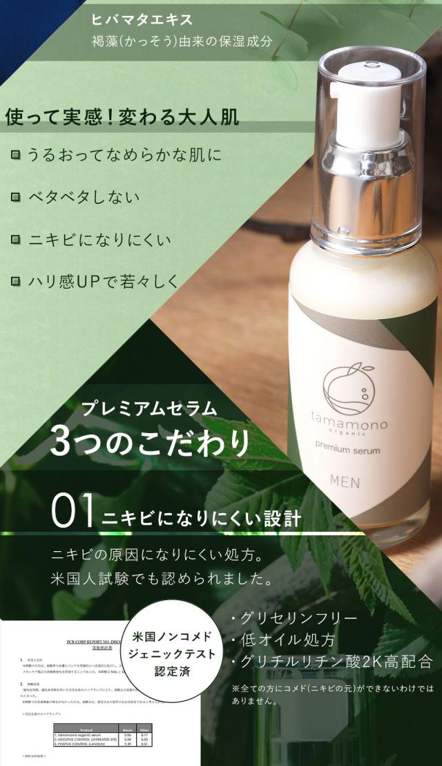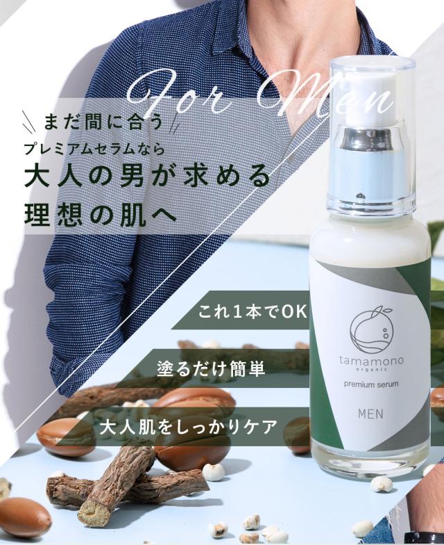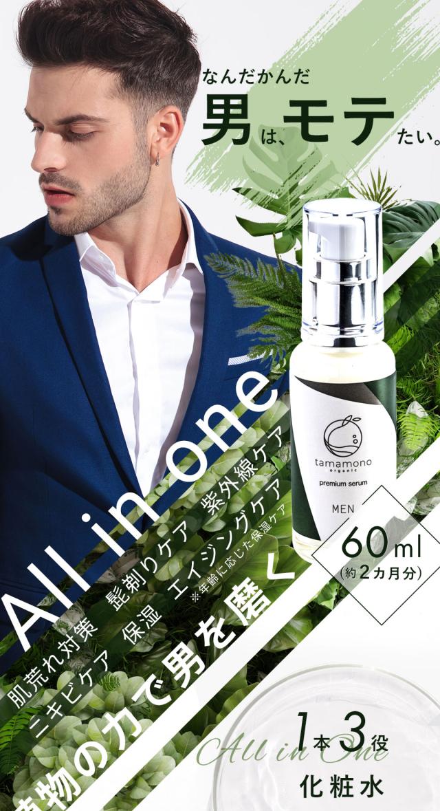 tamamonoメンズ美容液は、1本で化粧水・乳液・美容液の役割を果たすオールインワン美容液です。植物の力を凝縮し、肌荒れやヒゲ剃り後のケア、紫外線やニキビ対策、保湿、エイジングケアを提供します。