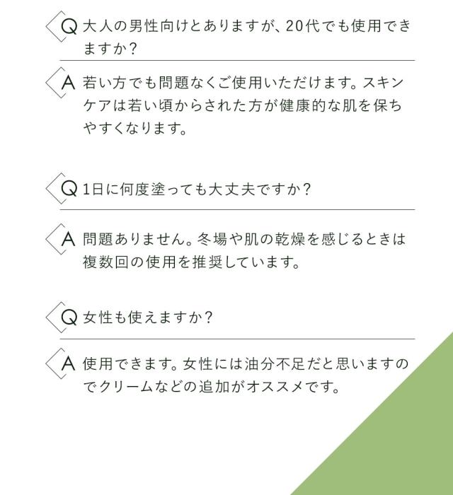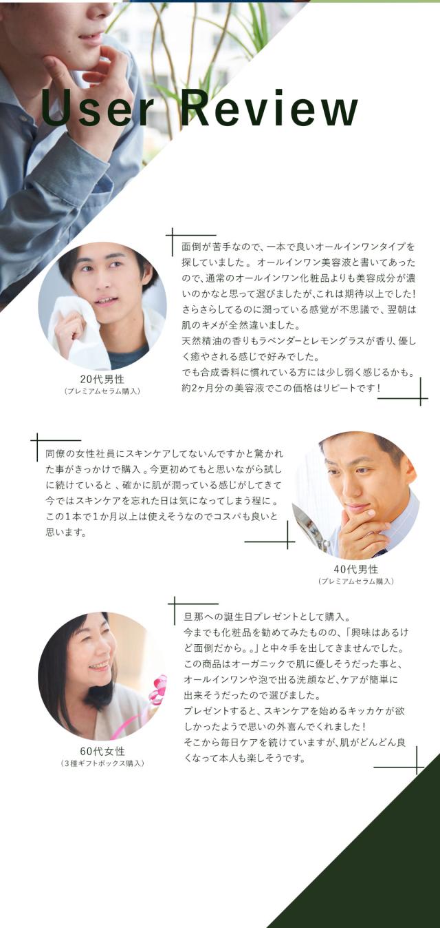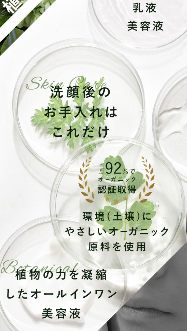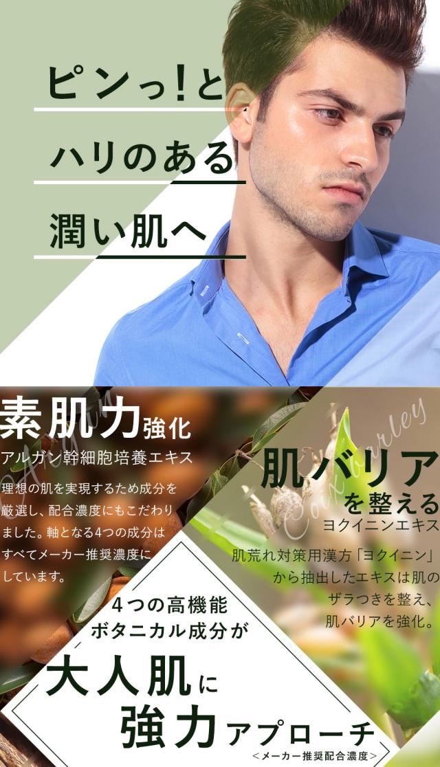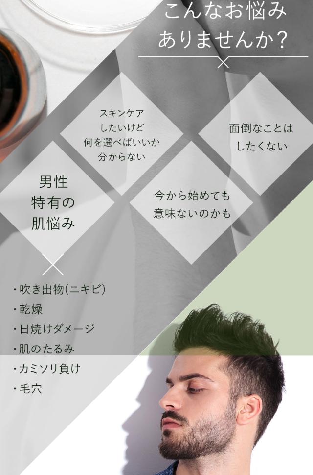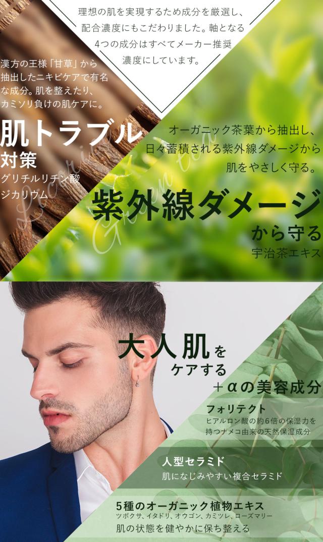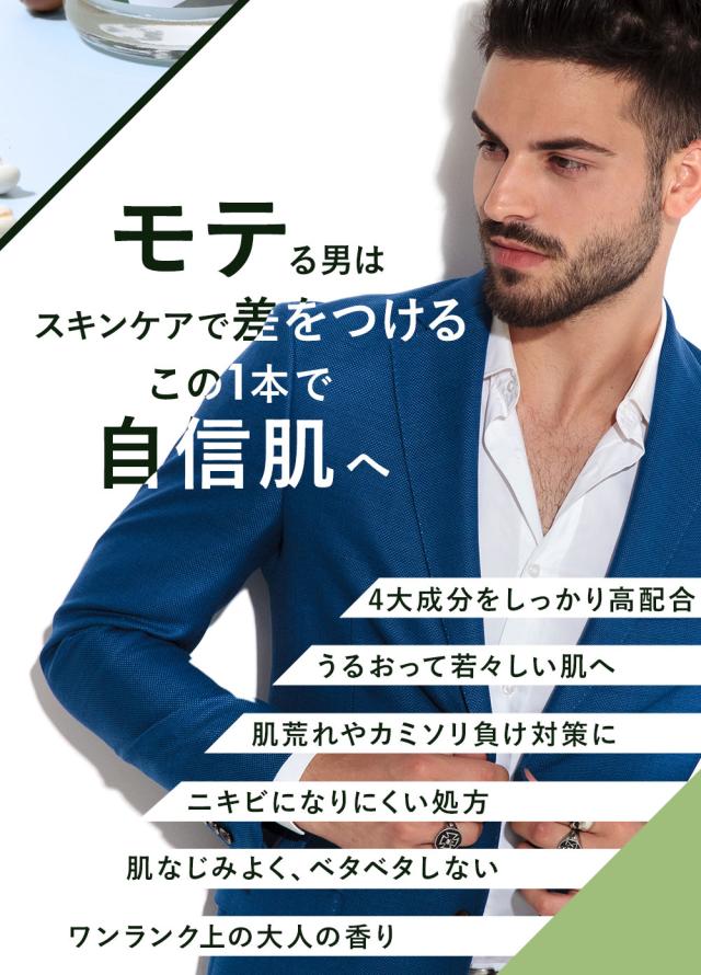 1本3役【化粧水・乳液・美容液】 1本で肌荒れに負けないうるおい肌へ オールインワンセラム 4つの高機能ボタニカル成分をメーカー推奨量配合した オールインワンタイプのプレミアム美容液。 男性の様々な肌悩みにオーガニック植物成分が的確にアプローチすることで 乾燥、肌荒れ、カミソリ負け、日焼けダメージケアなど男性の肌トラブルの心強い味方に。