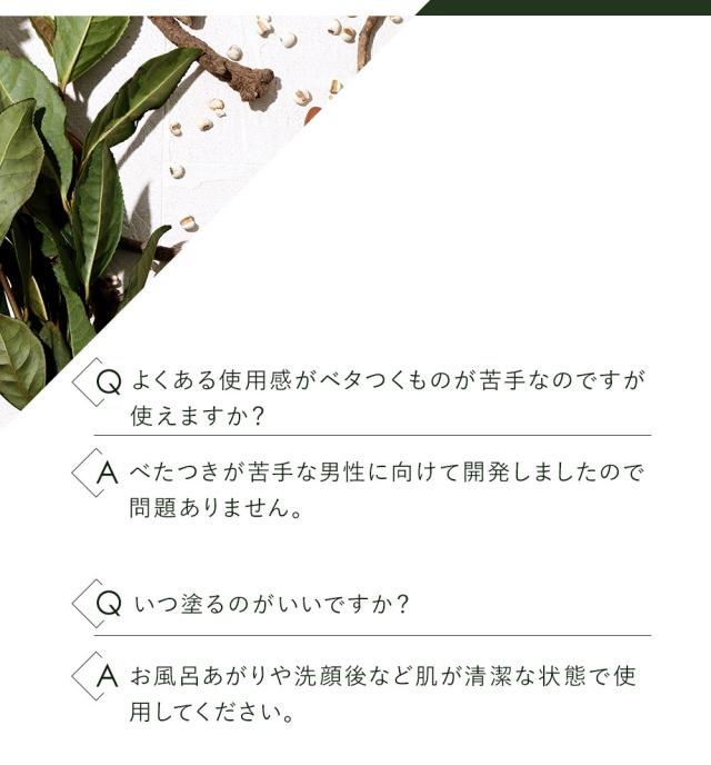 | 使用方法 | 1日1回〜2回、10円玉程度の量を清潔な肌に優しく馴染ませる |
