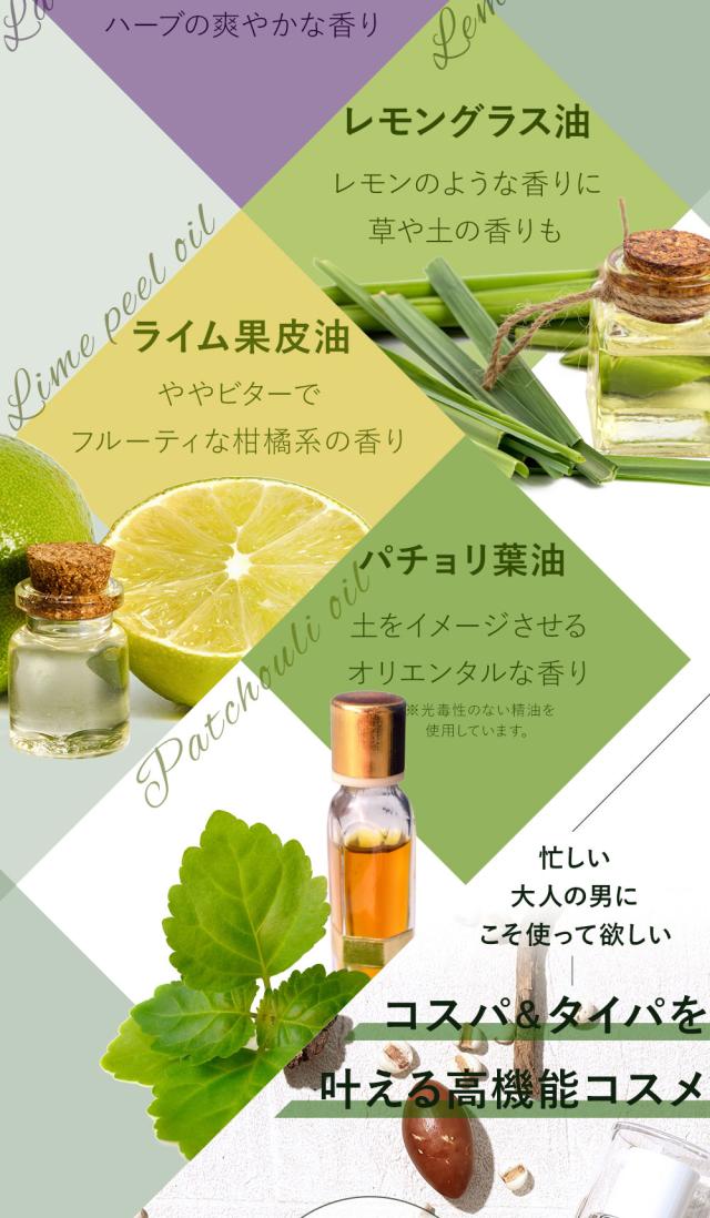 | 香り | 天然精油(ラベンダー、レモングラス、ライム、パチョリ) |