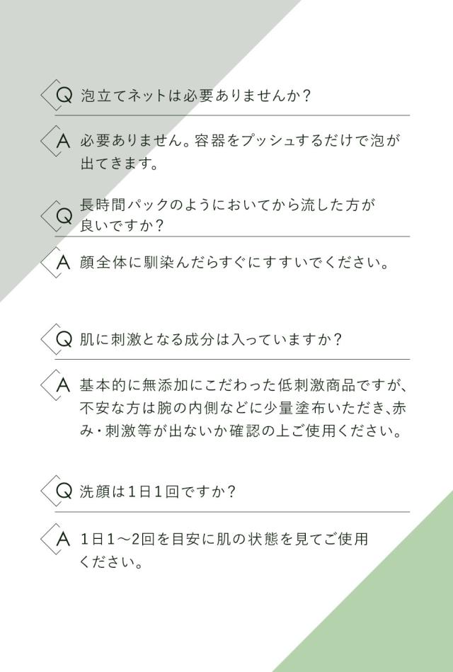1日1〜2回を目安に、ぬるま湯で軽く濡らした顔に適量の泡を塗布。 全体に行き渡ったら、ぬるま湯でしっかりすすぎ流す。 ※ゴシゴシ肌に刺激を与えるのはNG |