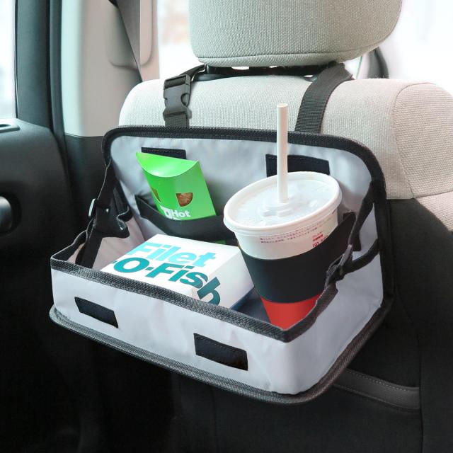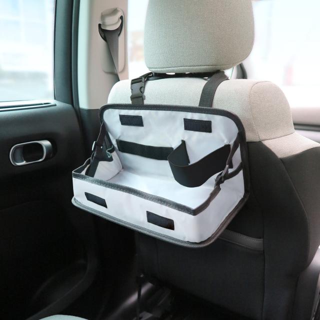 ヘッドレストに取り付ける、後部座席用のトレーです。バックル付きのベルトで簡単に装着できます。車内でのランチタイムに大活躍、長時間のドライブや渋滞も快適に過ごせます。