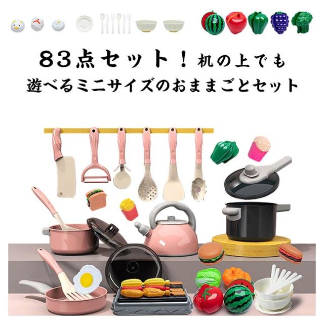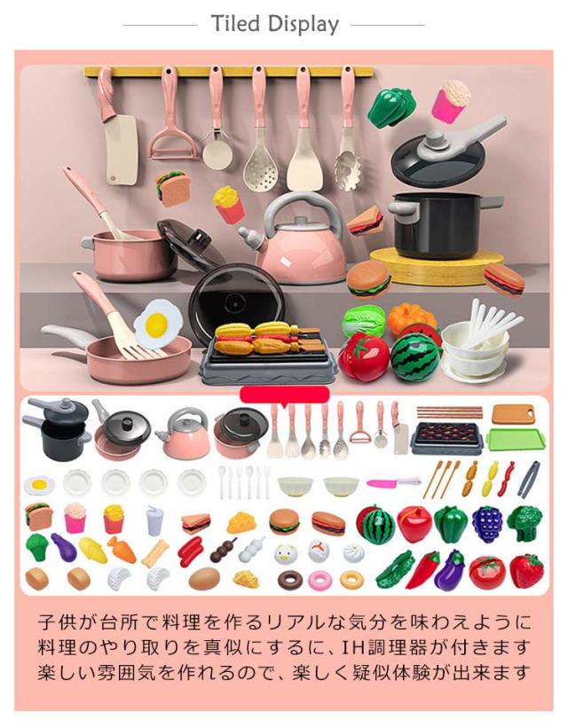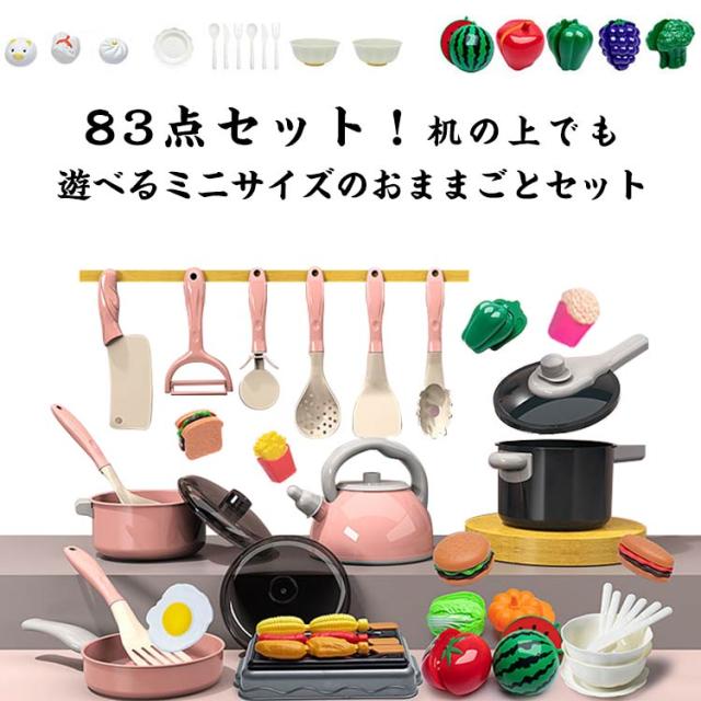 | 83点セット!机の上でも遊べるミニサイズのおままごとセット。 子供が台所で料理を作るリアルな気分を味わえように、料理のやり取りを真似にするに、IH調理器が付きます。楽しい雰囲気を作れるので、楽しく疑似体験が出来ます。 キッチン用具や食材などをたくさん揃っています。子どもに遊びながら、キッチン用具&食材の認知を習えます。 安全無毒なPP素材で作られ、優れた靭性。塗料も食品衛生法の着色検査をクリアしたものを使用しているので、万が一口に触れても安全な成分となっています。 鋭い部分も丸く処理していて、お子様の安全のために丁寧に作られたのです。 | |