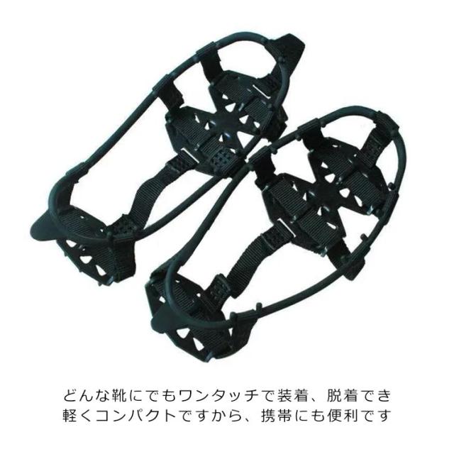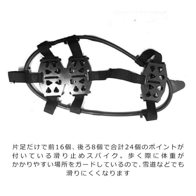 | 降雪時、氷結時シューズ・ブーツなどに取り付ける滑り止めスノースパイク 氷や雪の上で滑ったり、転んだりすることを防ぎます。 片足だけで前16個、後ろ8個で合計24個のポイントが付いている滑り止めスパイク。歩く際に体重がかかりやすい場所をガードしているので、雪道などでも滑りにくくなります。 どんな靴にでもワンタッチで装着、脱着でき、軽くコンパクトですから、携帯にも便利です。 通勤・通学・登山・ウォーキング等、冬の路面凍結時の転倒防止に!凍結路面での転倒などから身を守ります | |