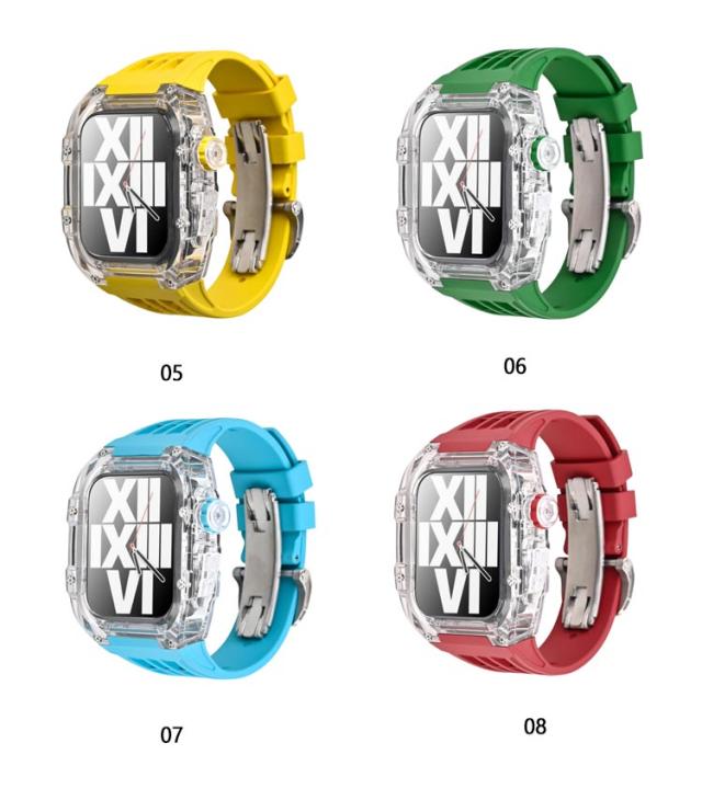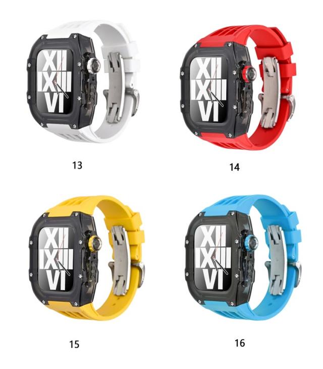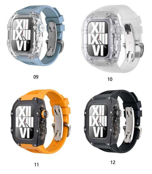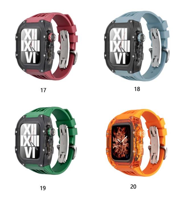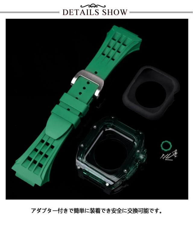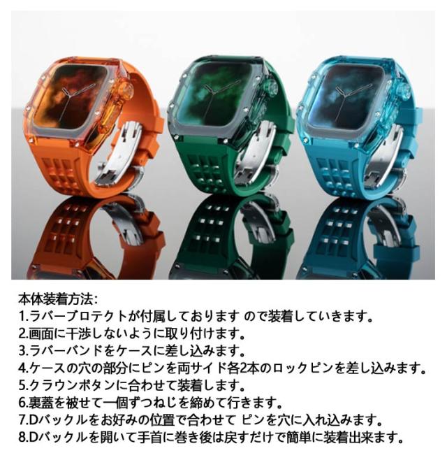 | アップルウォッチケースとアップルウォッチバンドの2点セットです。 カジュアルなアップルウォッチが上品で高級感のある腕時計のようになるケースベルトです。 半透明のアップルウォッチのケースも付いているのでオシャレのコーデが楽しめます。 ベルトは水に強いシリコン素材を使用。濡れたら乾いた布でさっと拭くだけ。汚れても水拭きできるので清潔感が保てます。 プライベートからオフィスシーンまで、シーンを選ばない優秀ベルト♪快適な着け心地をお楽しみください! アダプター付きで簡単に装着でき安全に交換可能です。 本体装着方法: 1.ラバーブロテクトが付属しております ので装着していきます。 2.画面に干渉しないように取り付けます。 3.ラバーバンドをケースに差し込みます。 4.ケースの穴の部分にピンを両サイド各2本のロックピンを差し込みます。 5.クラウンボタンに合わせて装着します。 6.裏蓋を被せて一個ずつねじを締めて行きます。 7.Dバックルをお好みの位置で合わせて ピンを穴に入れ込みます。 8.Dバックルを開いて手首に巻き後は戻すだけで簡単に装着出来ます。 | |
