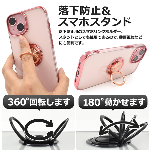 スマホケース iPhone15 スマホリング付 ソフトケース アイフォン15 クリアケース 背面 保護 カバー 透明 クリア 光沢 無地 シンプル アイホン iphone15 スマホカバー アイフォン ソフト 柔らかい スタンド ピンクゴールド シルバー ブラック かわいい おしゃれ iPhone 15