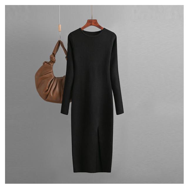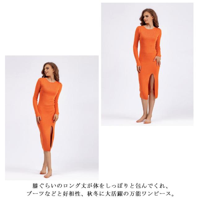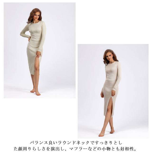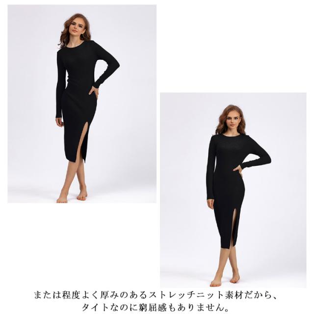 クルーネック ニットワンピース ロング 前スリット ニットタイトワンピース 前スリット ニットワンピ タイト 大人 セクシー 春 秋 冬