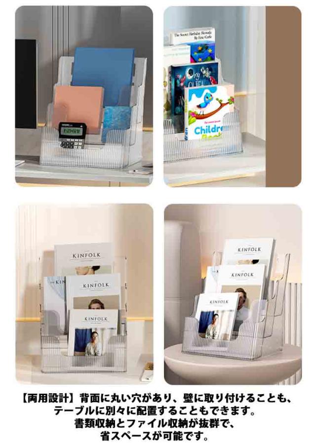 | 【卓上収納ラック】【大容量4段】【壁掛けにも】 4段の仕切り設計されたファイルラックは雑誌、ノート、新聞、辞書、付箋、文具などの収納整理にぴったりです! 書類を分類して整理したり、雑誌やノートなどの見せる収納におすすめのアイテムです。 仕切りがありますので、ファイルを分かりやすく分類し、検索にもより高効率で快適になります。 【高品質素材】耐久性よく、堅牢性が高く、長時間使えます。また、シンプルなデザインは机の色に合わせて、高級感があります。 クリア設計なので出したい物を気軽に見つけます。背面メッシュデザインは風通しがよく乾燥しているため、ほこりがたまりにくいです。 【両用設計】背面に丸い穴があり、壁に取り付けることも、テーブルに別々に配置することもできます。書類収納とファイル収納が抜群で、省スペースが可能です。 | |