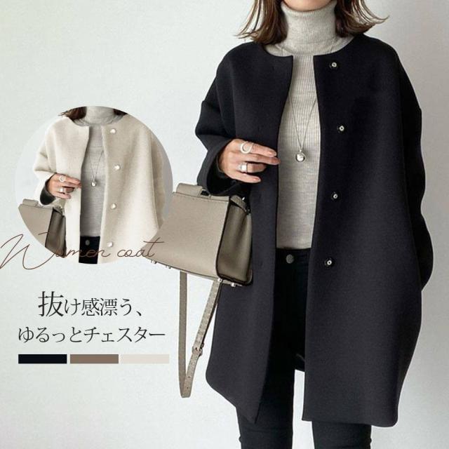 ノーカラーコート レディース 秋冬コート 50代 チェスターコート アウター ミドル丈 トレンチコート 着痩せ 上品 ウィンドブレ