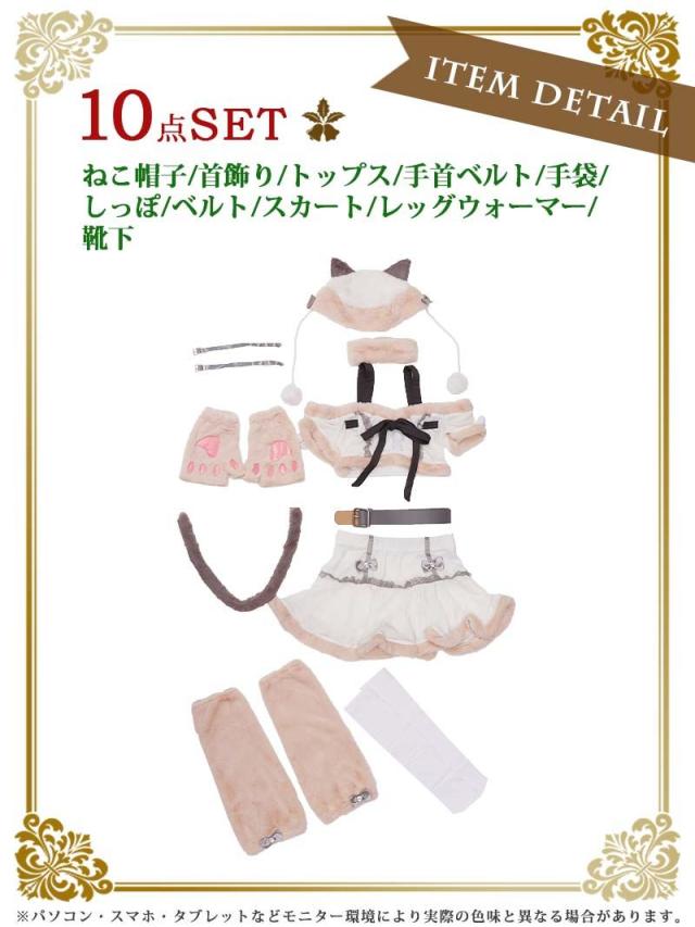 セット内容:ねこ帽子・首飾り・トップス・手袋・手首ベルト・スカート・ベルト・靴下・レッグウォーマー・しっぽ