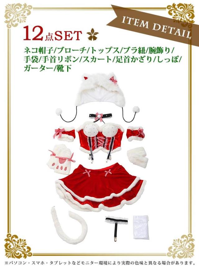 セット内容:帽子・ネコ帽子・ブローチ・トップス・ブラ紐・腕飾り・手袋・手首リボン・スカート・ガーター・靴下・足首かざり・しっぽ