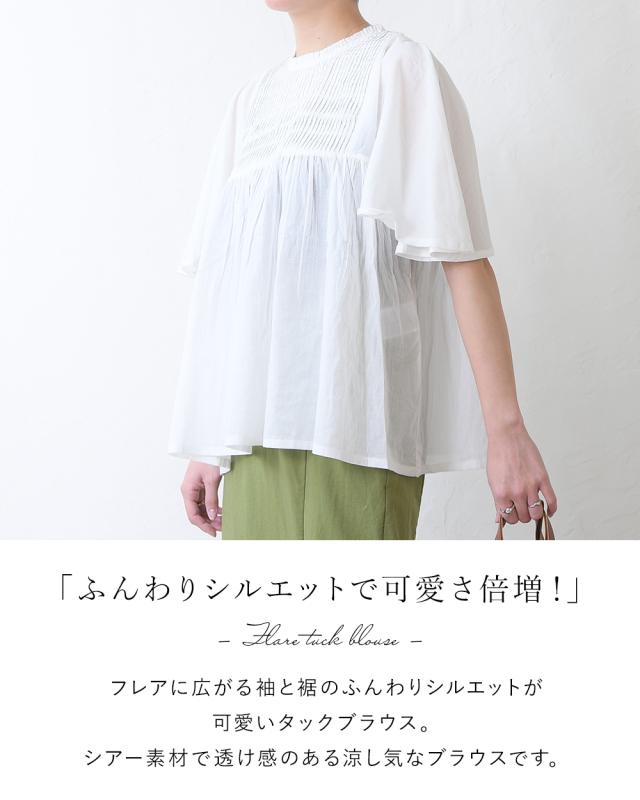 ブラウス レディース タック袖 タックブラウス トップス シアーブラウス シアー素材 シースルー フレア フレアブラウス 半袖 ゆったり おしゃれ 体型カバー ナチュラル オフィス 仕事 お仕事 ブルー 青 アイボリー 白 ホワイト ピンク 黒 春 夏