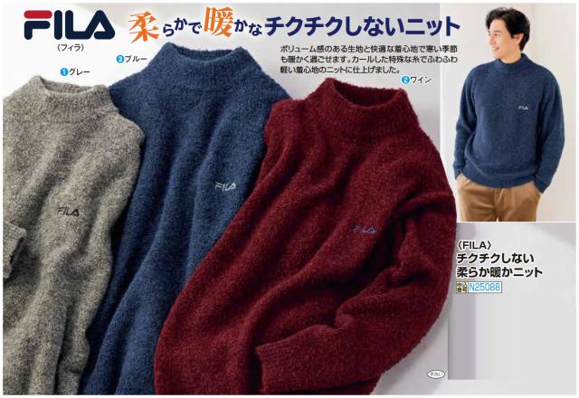 フィラ チクチクしない柔らか暖かニット 全3色 ニット セーター ハイネック メンズ 紳士服 シニア 男性 グレー ワインレッド ブルー 灰色 青 赤 シンプル fila ロゴ シニアファッション 40代 50代 60代 70代 80代 父の日 お父さん 秋物 冬物 秋冬 fri p25088