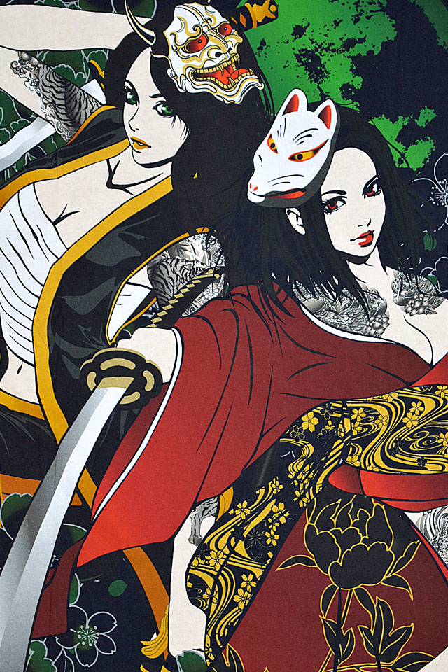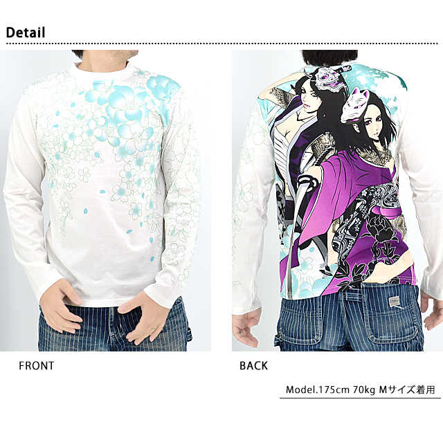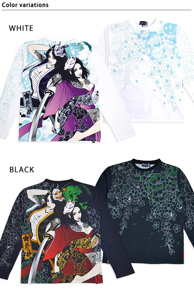 絡繰魂の姉妹ブランドとして誕生した、従来の和柄から抜け出し、和の持つ美しさを融合させた【抜刀娘】から「抜刀娘 能楽ロングTシャツ(234866)」のご紹介です。 日本の伝統芸能「能楽」を披露する二人娘を背中に落とし込んだ長袖Tシャツです。 着物や帯の柄まで細かく描き込みが施されているところが抜刀娘ならでは。 身頃を跨いで描かれた桜は袖へと続いており、実際に着用した際には柄がより立体的に浮かび上がる仕様になっています。 ボディーには、綿100%のさらりとした柔らかなTシャツ生地を使用。 | |||||||||||||||||||||||||