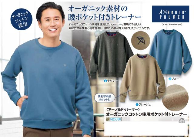 アーノルド・パーマー オーガニックコットン使用ポケット付トレーナー 全3色 スウェット トレーナー メンズ 紳士服 シニア 男性 クルーネック グレージュ ベージュ グレー ブルー 丸首 シンプル シニアファッション 40代 50代 60代 70代 80代 父の日 お父さん 秋物 冬物 秋冬