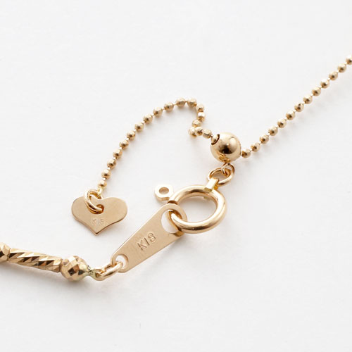 ネックレスの留具部分には、 「K18」の刻印が施されており、シンプルでありながら、見えない部分にも手の込んだ、こだわりを感じます。