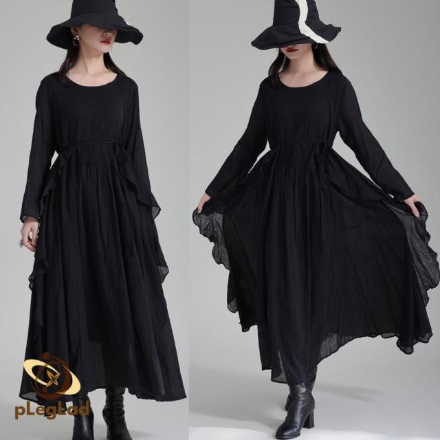 ワンピース ロング ドレス 長袖 フリル レディース モード系 個性的 ロング丈 ワンピ コットン リネン aライン 大人女子 ゆったり 体型カバー 黒 秋冬 40代 30代 20代