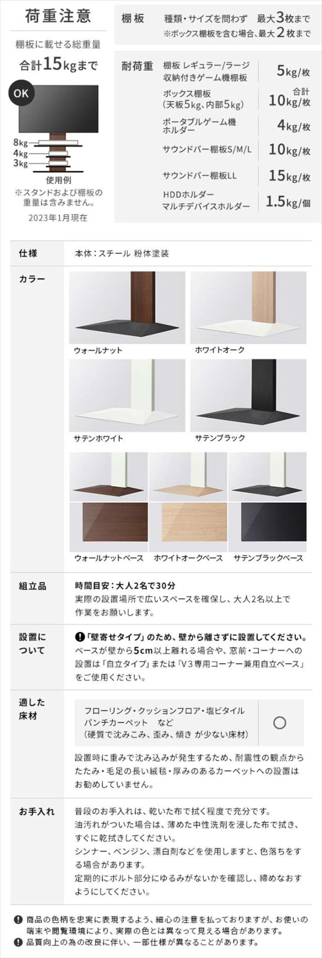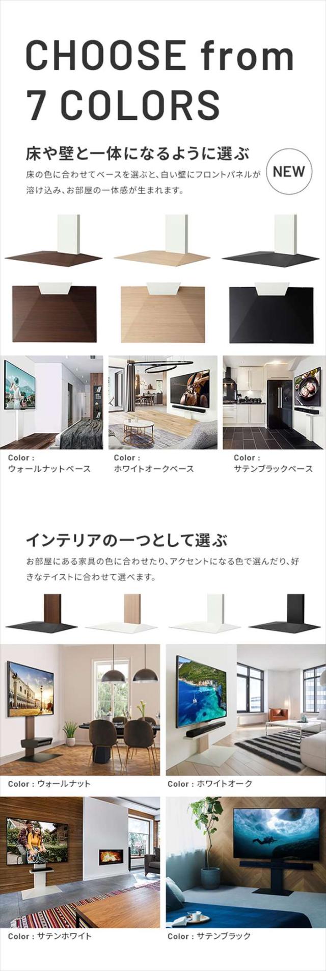 WALLインテリアテレビスタンドV3 ハイタイプ。カラーは、サテンホワイト(4589443459478:wltvb6111)、サテンブラック(4589443459485:wltvb6119)、ホワイトオーク(4589443459508:wltvb6232)、ウォールナット(4589443459492:wltvb6238)、サテンブラックベース(4589443467039:wltvb6w19)、ウォールナットベース(4589443466988:wltvb6w38)、ホワイトオークベース(4589443466995:wltvb6w32)、です。