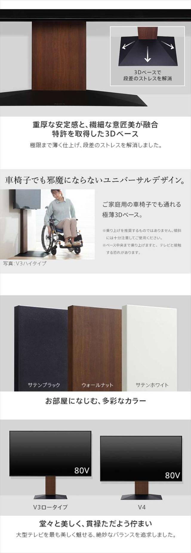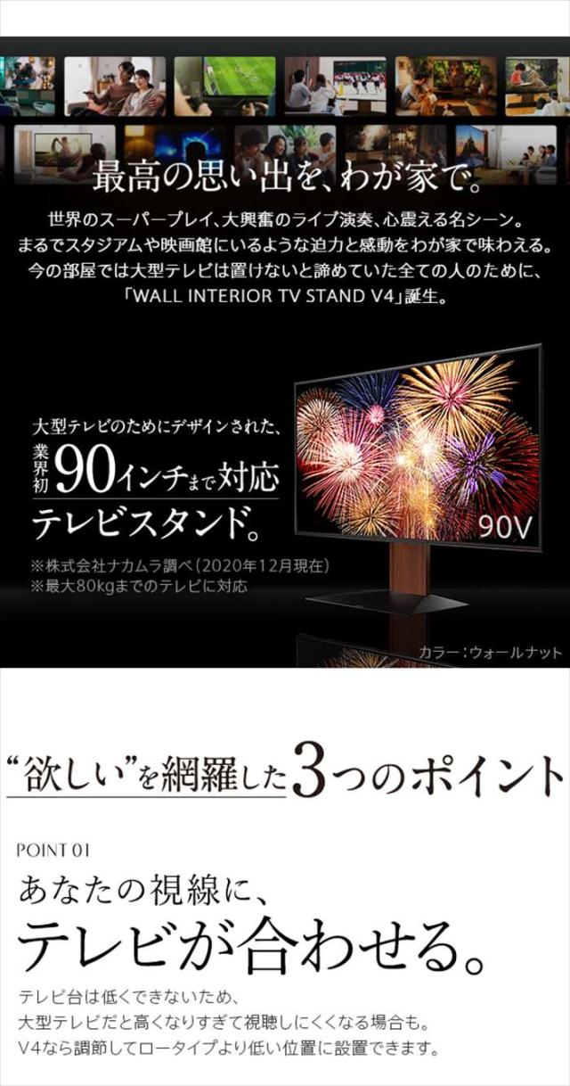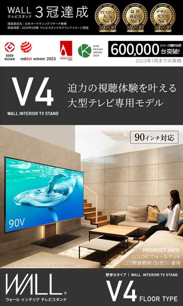 WALLインテリアテレビスタンドV4。カラーは、サテンホワイト(4589443459553:wltvj5111)、サテンブラック(4589443459560:wltvj5119)、ウォールナット(4589443459577:wltvj5238)、です。