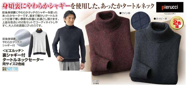 ニット セーター 裏シャギー メンズ ピエルッチ 裏シャギー付 タートルネックセーター 2色組 紳士服 シニア 男性 ハイネック ワインレッド ネイビー 赤 紺色 シンプル 暖かい あったかい ファッション 40代 50代 60代 70代 80代 父の日 お父さん 秋冬 sai p25109