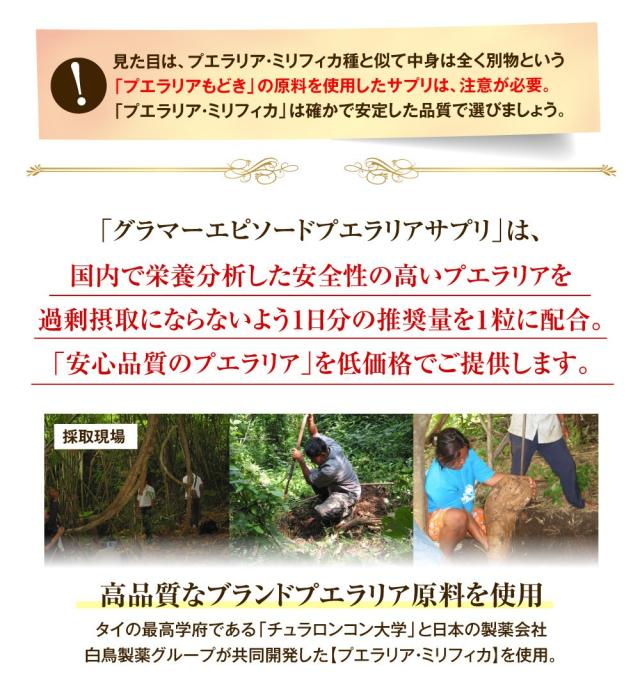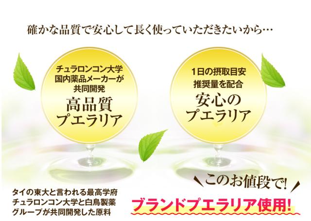 本品はプエラリアの本場タイのチュラロンコン大学と国内の製薬会社が共同開発した高品質で内容が安定した高品質なプエラリアを使用しております。